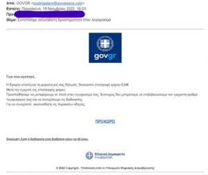 Σας ενημερώνουμε, ότι είναι σε εξέλιξη αποστολή phishing email. Πρόκειται για απάτη κατά την οποία ο κακόβουλος χρήστης υποδύεται την Ελληνική Κυβέρνηση, ενημερώνοντας ότι δικαιούστε επιστροφή φόρου. Παρακαλούμε όπως διαγράψετε άμεσα το email και μην ανοίξετε κανένα σύνδεσμο.