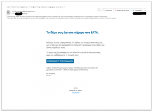 Σας ενημερώνουμε, ότι τις τελευταίες ώρες είναι σε εξέλιξη αποστολή phishing emails. Πρόκειται για απάτη κατά την οποία ο κακόβουλος χρήστης υποδύεται μία αξιόπιστη οντότητα (ΕΛΤΑ Α.Ε) με σκοπό την αθέμιτη απόκτηση διαπιστευτηρίων πρόσβασης σε πιστωτικές κάρτες των χρηστών.