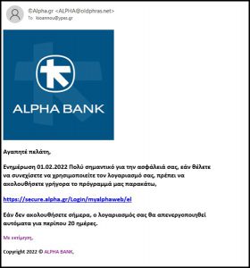 Στην εικόνα 1, φαίνεται ενδεικτικά το email που έχει αποσταλεί σήμερα. Αντίστοιχα email αποστέλλονται από κακόβουλους χρήστες υποδυόμενοι και άλλες Ελληνικές Τράπεζες.